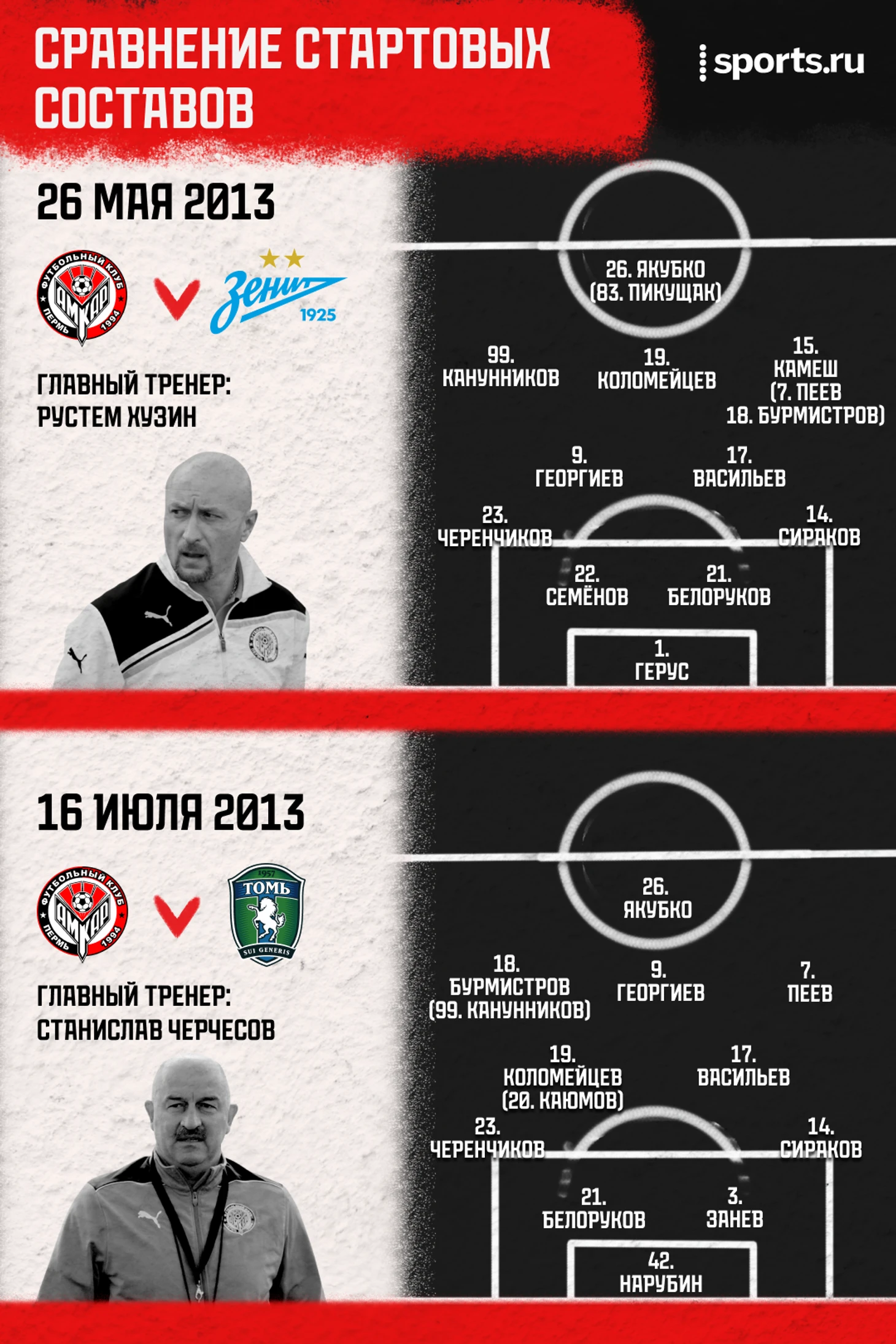 Для наглядности сравним этот состав с футболистами, которые вышли в основе последнего матча сезона-2012/13 при Рустеме Хузине против питерского «Зенита» (0:0). Против «Томи» Черчесов выпустил состав по такой же схеме 4-2-3-1, однако опустил ближе к центру Коломейцева и перевел Георгиева на позицию атакующего полузащитника. На место первого номера команды вернулся Сергей Нарубин.