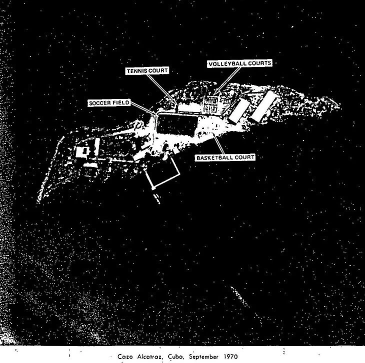 В отличие от воспоминаний Роберта Кеннеди, в книге Боба Холдемана используется слово soccer, а не football. Речь шла в том числе об острове Кайо Алькатрасе, расположенном в бухте недалеко от Сьенфуэгоса. На снимке можно разглядеть не только футбольное поле, но также площадку для волейбола и теннисные корты. США предположили, что СССР строит базу для подводных лодок. Кажется, американцы сильно идеализировали условия, в которых служили советские солдаты и офицеры.