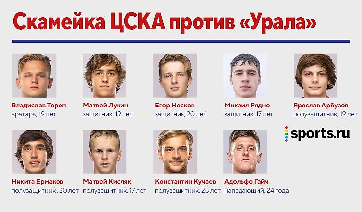 Скамейку ЦСКА не узнать. В игре с «Уралом» почти весь запас – из юных воспитанников. Среди опытных лишь Константин Кучаев и вернувшийся из Италии Адольфо Гайч.