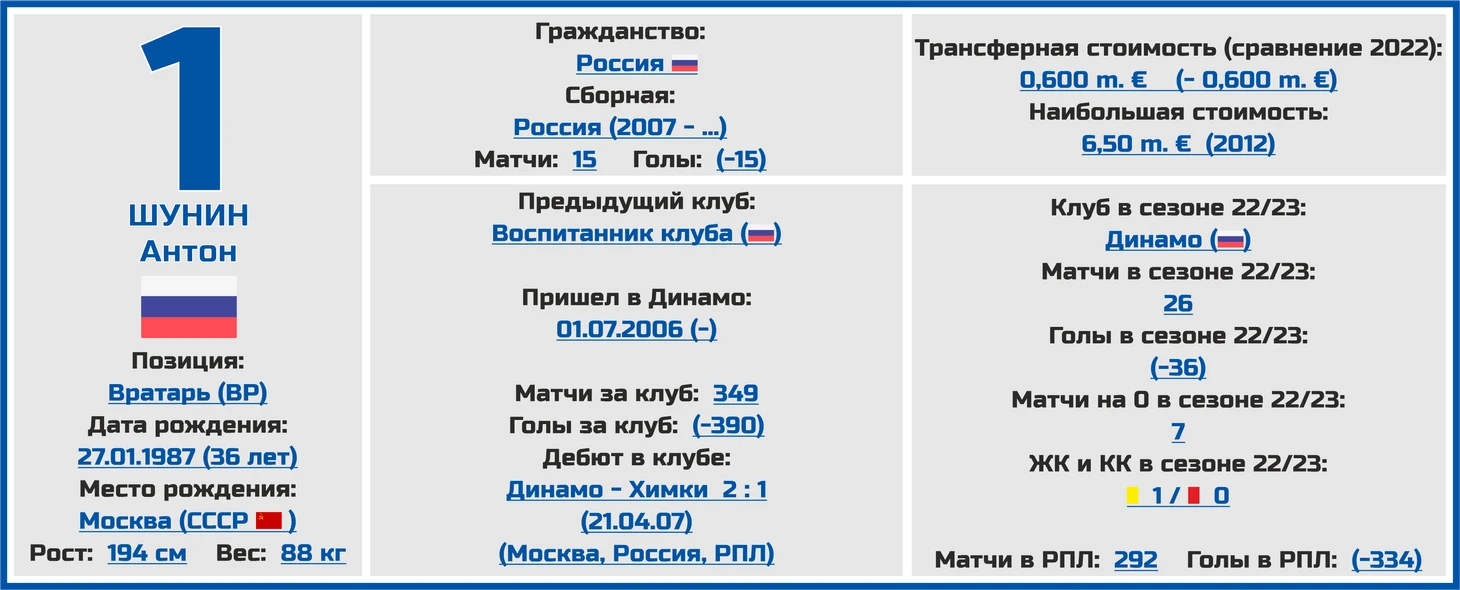 Основным вратарём «Динамо» в этом сезоне будет главный старожил клуба, 36-летний Антон Шунин (в команде играет аж с 2006 года), однако расслабляться ему явно не стоит, так как за его спиной есть вовсю рвущийся в основу Игорь Лещук, да и молодые стражи ворот уже сейчас готовы составить им достойную конкуренцию (Иван Будачёв много играл на сборах перед сезоном, а Илья Купцов и вовсе уже дебютировал за динамовцев в матче Кубка России против «Пари» из Нижнего Новгорода).