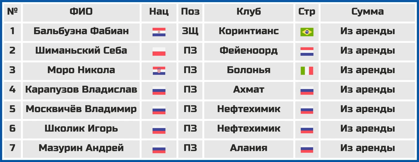 Главным трансферным активом московской команды в это межсезонье, как уже не раз было написано выше, является возвращение в состав центрального защитника Фабио Бальбуэны, игрока, имеющего опыт выступлений даже в АПЛ (играл там за лондонский клуб «Вест Хэм Юнайтед»).