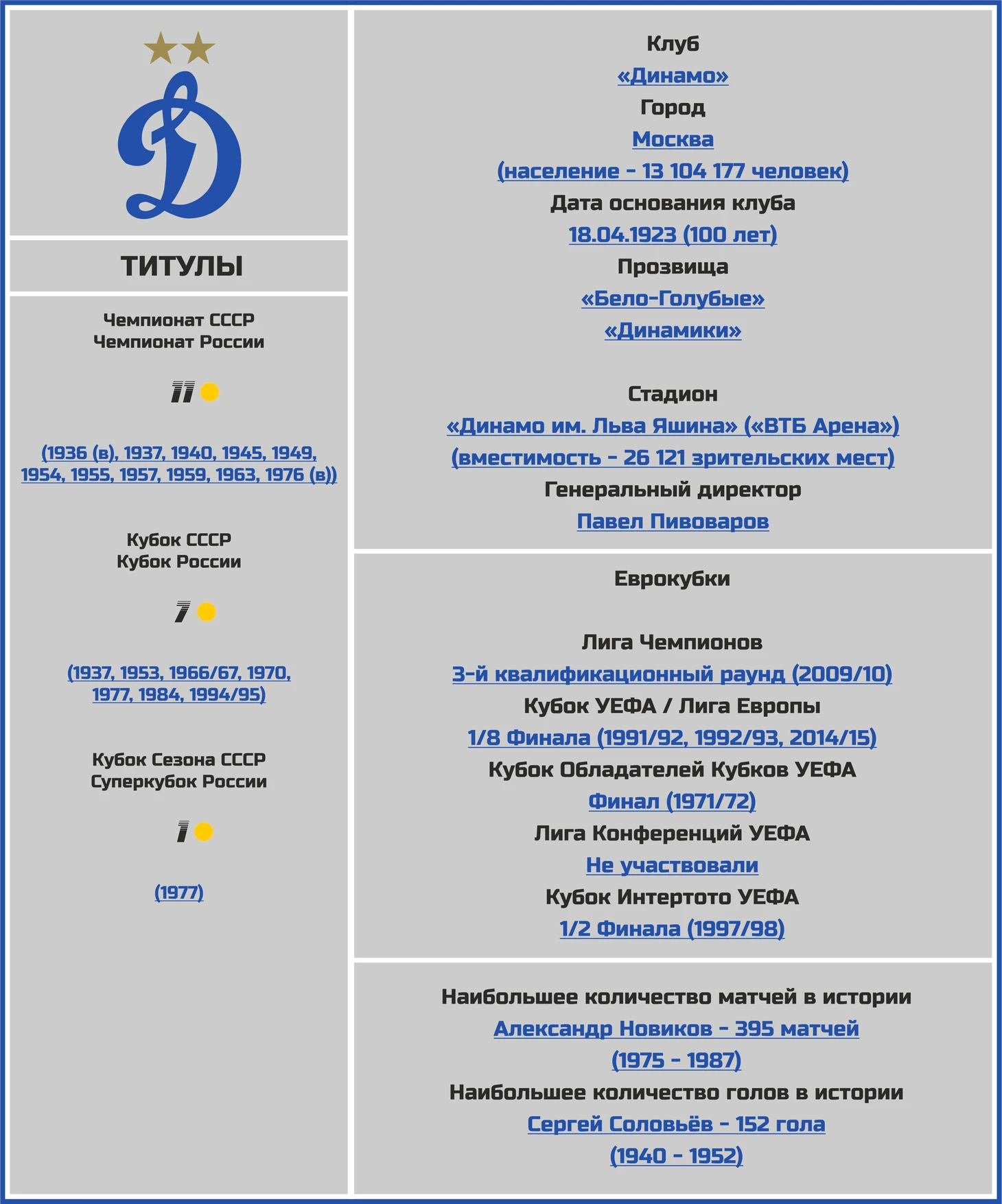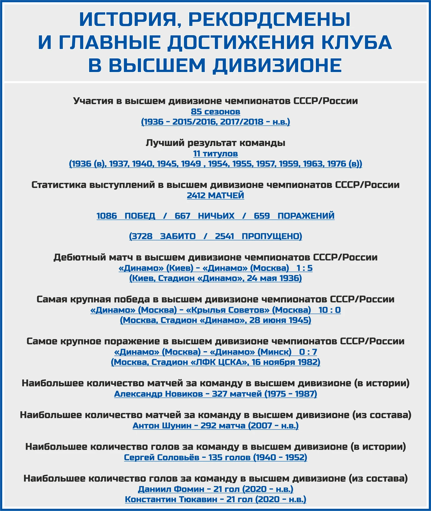«Бело-голубые» являются не только единственной командой, принимавшей участие во всех 54 розыгрышах чемпионата СССР по футболу, но и являются его 11-кратным победителями.