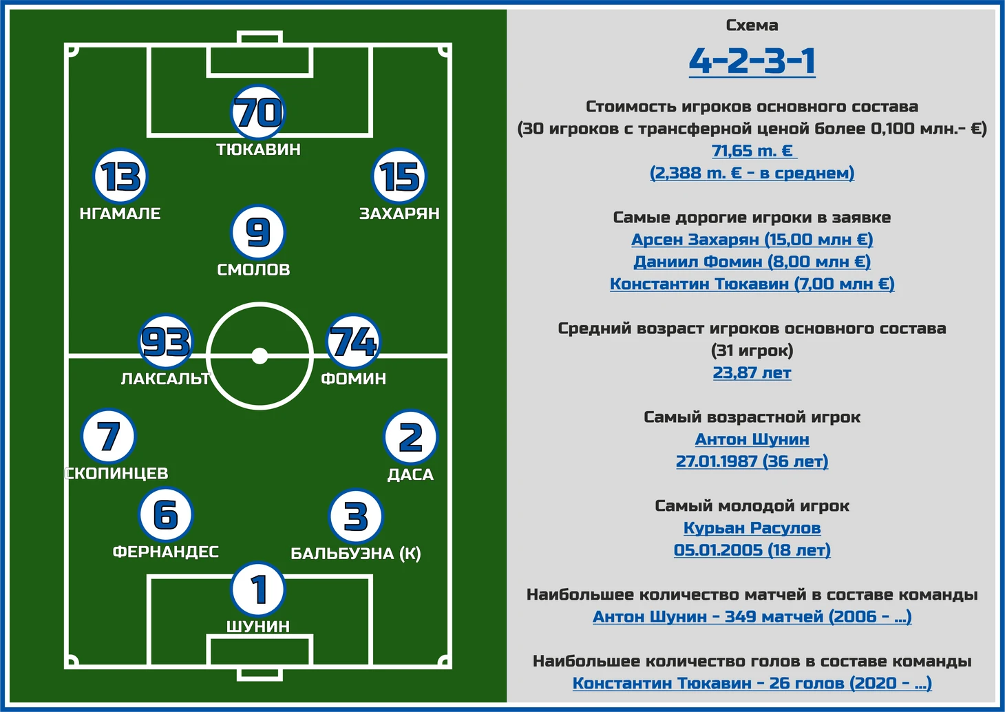 На флангах тоже все по именам достаточно хорошо - на правой бровке между собой спорят за место в основе опытный Сергей Паршивлюк и игрок сборной Израиля Эли Даса, а на противоположной бровке есть один из лучших крайков РПЛ Дмитрий Скопинцев, а так же звездный уругваец Диего Лаксальт (последнего, правда, Личка видит теперь больше как опорного полузащитника).