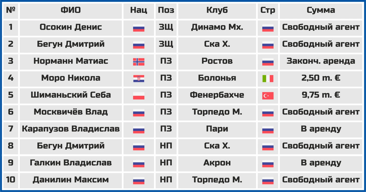 Помимо этого случилась странная ситуация с норвежцем Матиасом Норманном (игрок самовольно уехал из страны и возвращаться явно не собирается, тут явно будет теперь судебное разбирательство), а так же в очередные аренды ушли некоторые российские игроки, непопадающие в состав команды (Владислав Карапузов и его тезка Галкин).