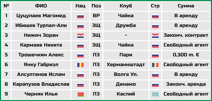 Из тех кто покинул клуб в это трансферное окно отметим хорватского защитника Зорана Нижича (у 33-летнего ветерана закончился контракт), а так же переход в нижегородский «Пари» полузащитника Александра Трошечкина.