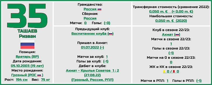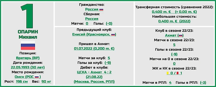 В запасе есть еще один опытный страж ворот - Михаил Опарин (до перехода в клуб достаточно долгое время был основным вратарём в красноярском «Енисее»), да совсем молодой Ризван Ташаев, который дебютировал за основной состав «Ахмата» только в прошлом сезоне.