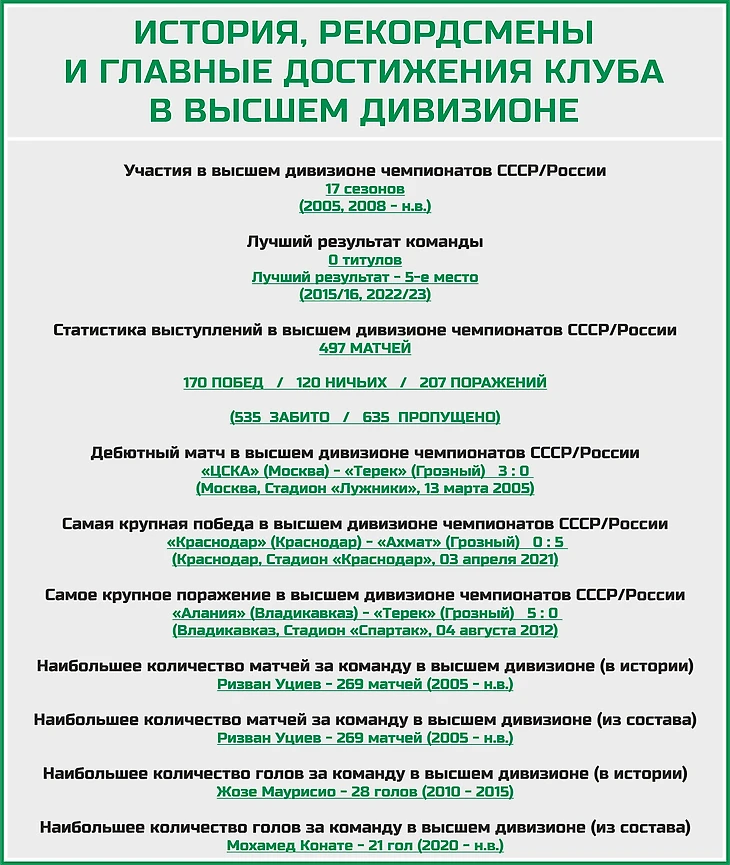 Несмотря на то, что грозненский клуб официально существует аж с 1946 года, впервые в высшей Лиге отечественного футбола команда сыграла лишь в 2005-м году (да и то неудачно, заняв в том сезоне последнее 16-е место в турнире и вылетев назад в Первую Лигу).