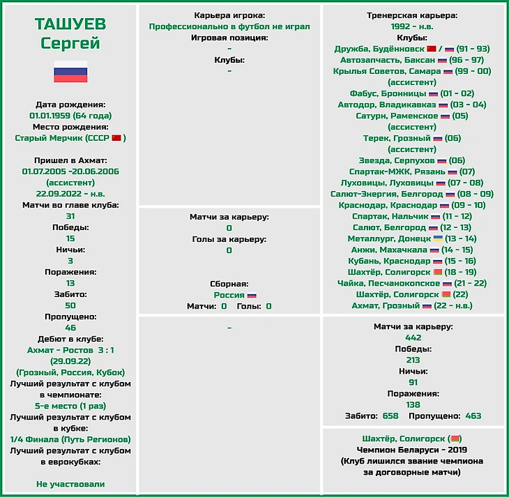 Второй приход Сергея Ташуева в «Ахмат» случился в сентябре 2022 года, когда он сменил на этом посту Андрея Талалаева (между ними команду еще 10 дней тренировал Юрий Нагайцев).