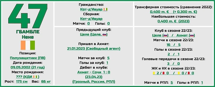 Нене Гбамбле появился в грозненском «Ахмате» только этой зимой, однако уже показал свой потенциал во всей красе (игрок, правда, травмировался в конце сезона и успел провести за клуб только 5 встреч, но уже забил 1 гол).