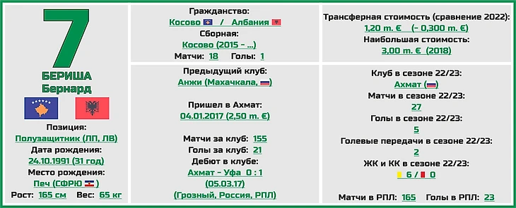 Бернард Бериша играет в российском чемпионате уже достаточно давно (до выступлений в «Ахмате» футболист играл в махачкалинском «Анжи»), и нынешний для него сезон в России юбилейный, уже 10-й по счету (на счету игрока 165 игр в РПЛ и 23 забитых мяча).