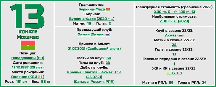 Прошлый сезон для Мохамеда Конате явно удался, его клуб финишировал в первой пятерке, а сам футболист не только стал лучшим бомбардиром команды (11 мячей в 24 турах РПЛ + 2 в кубке России), но и установил личный рекорд результативности за сезон (до этого 25-летний форвард максимум забивал лишь 8 голов - за армянский «Пюник» и в свой первый сезон в «Ахмате»).