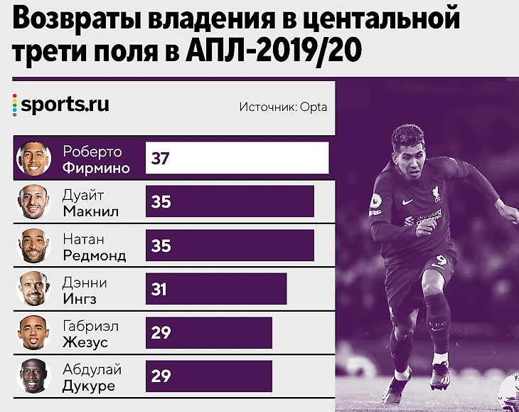 В чемпионском сезоне-2019/20 Фирмино стал лучшим по возвратам владения в финальной трети среди всех игроков АПЛ.