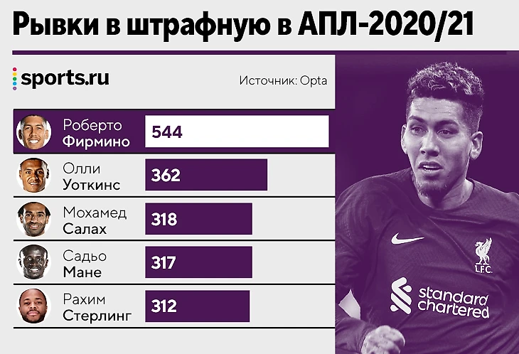 Во-первых, постоянное движение без мяча. Фирмино выдавал колоссальные объемы беговой работы, предлагая варианты для паса: и опускался в опорную соперника, и вбегал в штрафную. В сезоне-2020/21 он делал это в исторических масштабах, отрыв от второго места – 182 рывка.