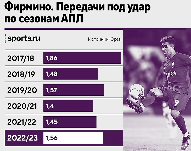 Критика уместна: сезоны-2019/22 Фирмино заканчивал с отрицательной разницей «забитые голы минус ожидаемые». Такая затяжная регрессия для форварда топ-клуба непозволительна. В том числе из-за этого он уступил конкуренцию приобретенному в рассрочку (о многом говорит, правда?) Диогу Жоте, а затем и Дарвину Нуньесу.
