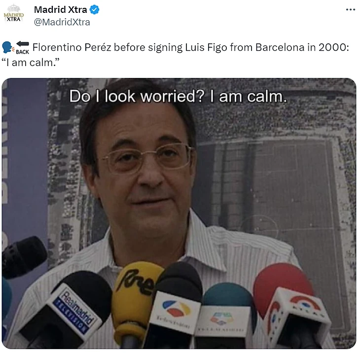 Поклонники «Мадрида» вспомнили, что Перес говорил нечто похожее больше 20-ти лет назад, когда «сливочные» готовились подписать Фигу. Тогда Флорентино сказал: «Я выгляжу взволнованным? Я спокоен».