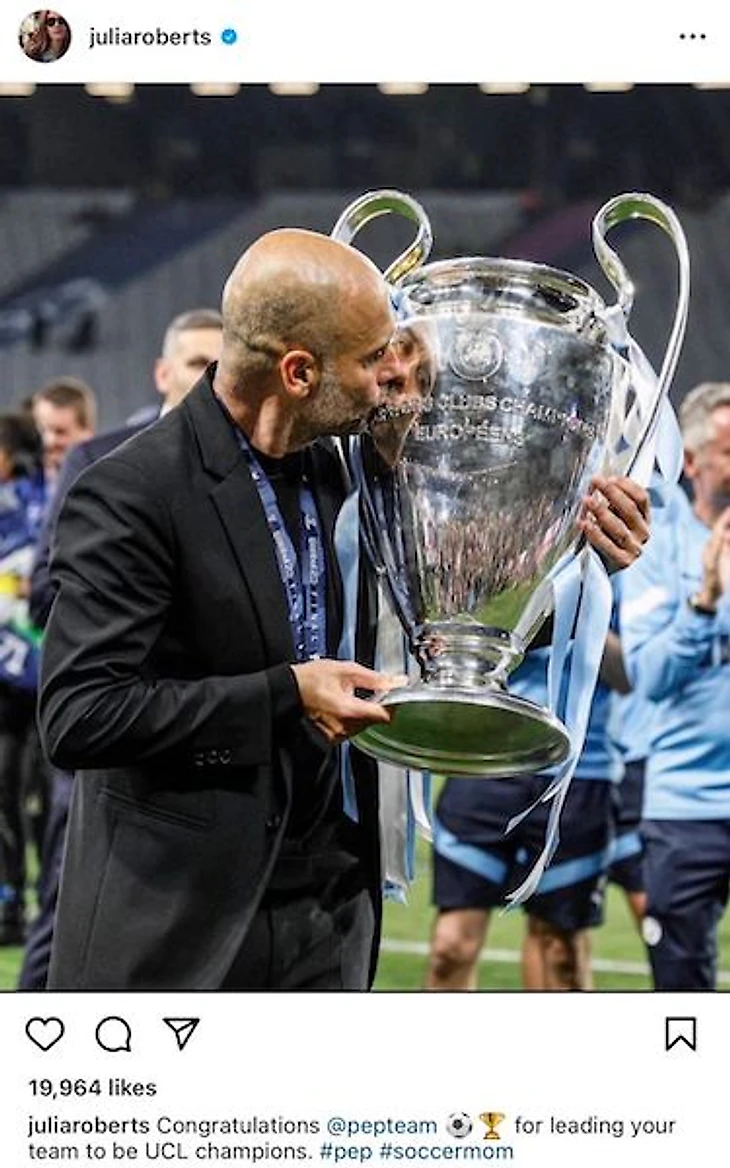 После победы «Сити» в ЛЧ актриса выложила фото тренера, целующего трофей, и написала: «Поздравляю Пепа Гвардиолу с тем, что он привел свою команду к победе в ЛЧ».