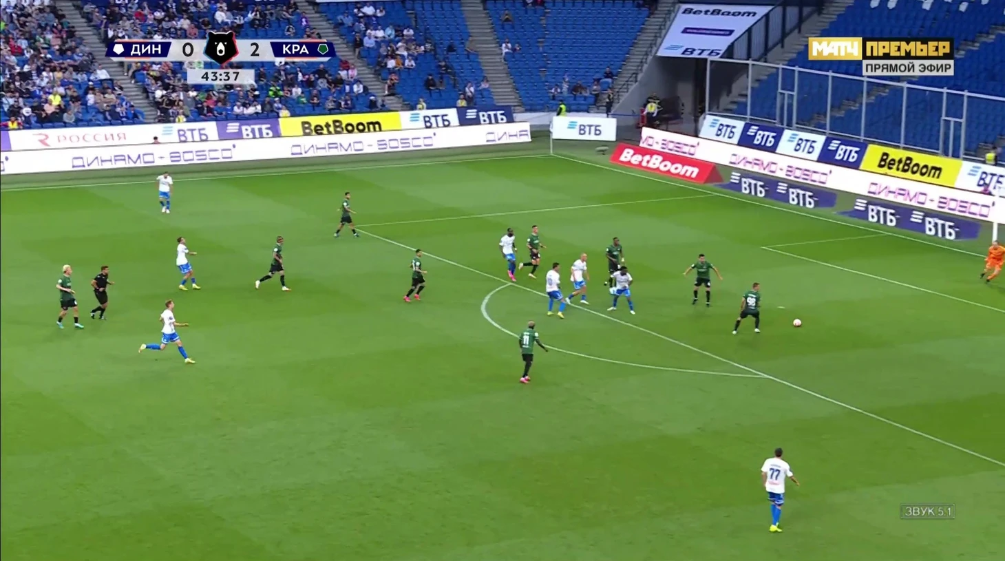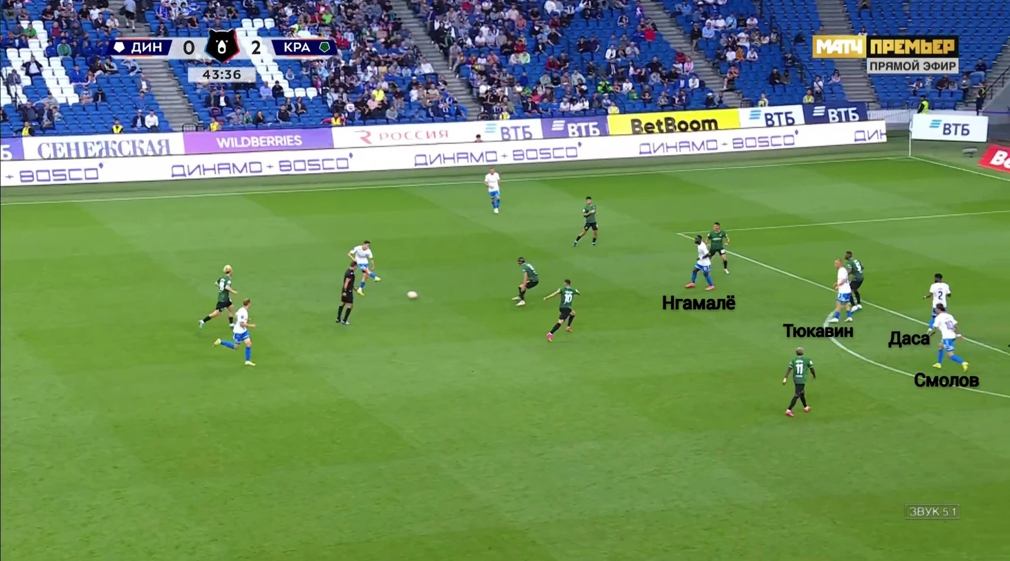 Для московского «Динамо» сезон начинался с домашней игры против «Краснодара». Личка выставил атакующий состав и все ждали большое количество опасных моментов. Расстановка хозяев оказалась очень смелой не только на бумаге: во время владений за ширину атаки отвечали фланговые защитники Скопинцев и Даса, а крайние нападающие действовали очень узко и часто оказывались в одной точке. Макаров, Нгамалё и Тюкавин должны были оказывать давление в центре, а Смолов опускался ниже для участия в розыгрыше мяча.