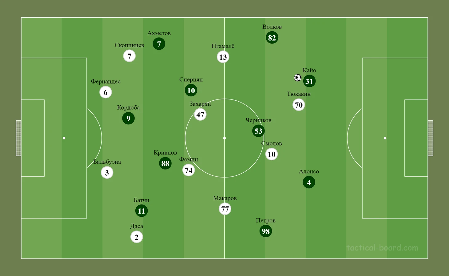 Оборонялась команда Лички по схеме 4-2-3-1: Захарян опускался в пару к Фомину, Нгамалё и Макаров – на фланги, а Смолов играл по опорнику в центре.