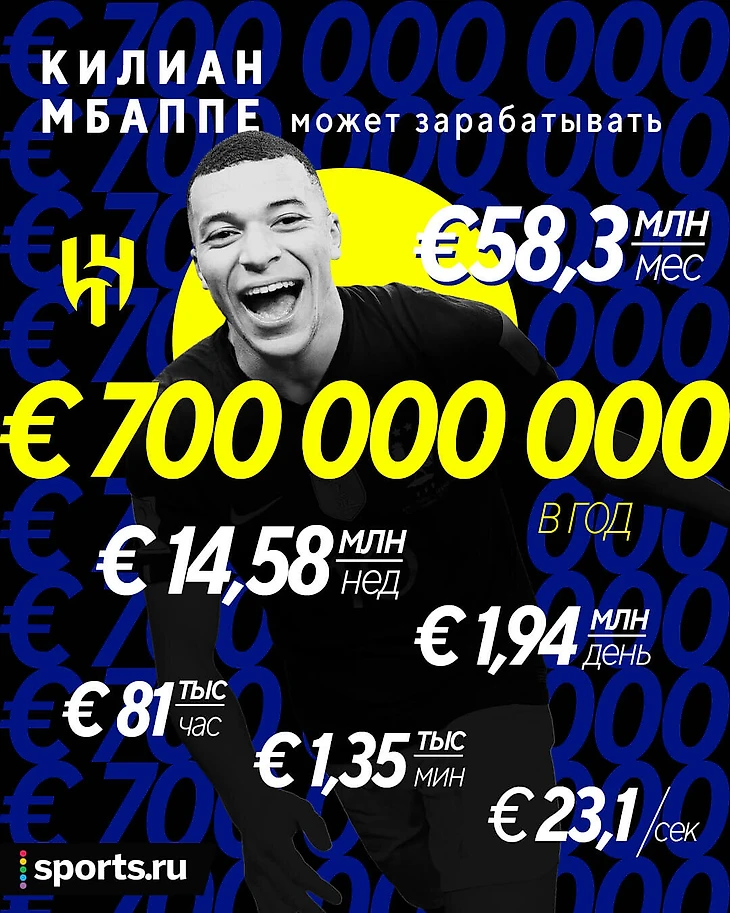 • Заплату Килиана в 700 млн евро за сезон первым озвучил журналист CBS Джеймс Бендж. Его коллега Маттео Моретто добавил: с учетом всех бонусов Мбаппе может заработать 1 миллиард евро за год игры в «Аль-Хилале».
