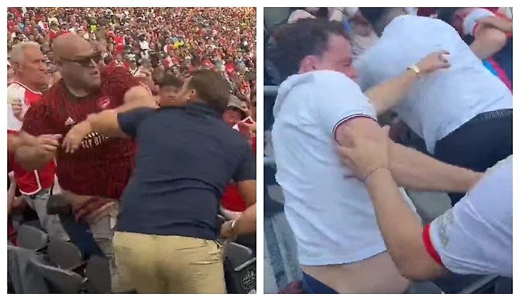 Жесть из США😱😱😱 Во время товарищеского матча «Арсенала» и «МЮ» на трибунах разразилась настоящая английская битва болельщиков