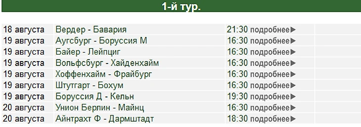 Первый тур Бундеслиги намечен на 18 августа, когда в гости в Бремен к местному «Вердеру» пожалует самый титулованный клуб страны мюнхенская «Бавария». Но главный матч тура состоится днем спустя в Леверкузене, где «Байер» примет «Лейпциг».