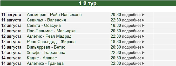 Ла Лига возьмет свой старт также 11 августа поединком между «Альмерией» и столичным «Райо Вальекано». В этот же день нас ожидает главная афиша тура «Севилья» - «Валенсия». На следующий день у мадридского «Реала» прогнозируется сложный выезд в Бильбао, а в воскресенье 13 августа действующий чемпион «Барселона» приедет в пригород Мадрида к «Хетафе».