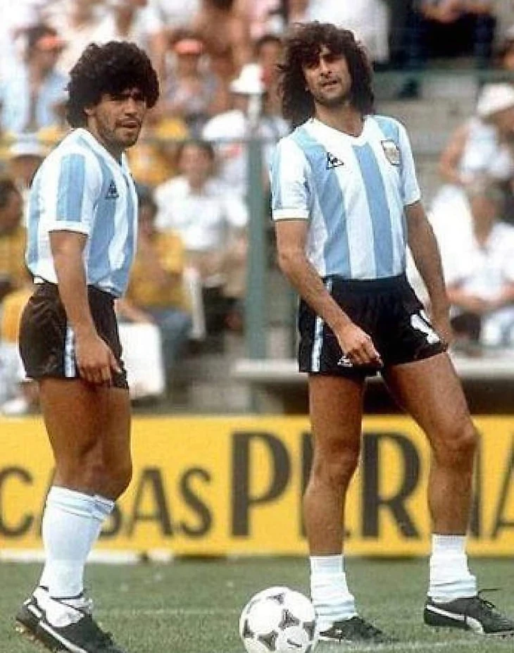 ЧМ-1982. Великие Художники, Гиганты и Волшебники Футбола: Диего Армандо МАРАДОНА и Марио КЕМПЕС. Перед матчем с Бразилией... Уже есть усталость, "надломленность" и...разочарование (в соперниках, неспособных играть в чистый и благородный футбол... и в судьях (неспособных и не желавших воспрепятствовать этому Беспределу, и по-сути превратившим матч: Аргентина - Италия в подлинную Охоту на аргентинских звёзд и в "Борьбу-Кэтч" - во что угодно любое, кроме Футбола...). Но есть ещё Вера в то что Аргентинская Сборная по-прежнему Лучшая (в Техническом и Творческом отношении!) и Сильнейшая на том Чемпионате!..