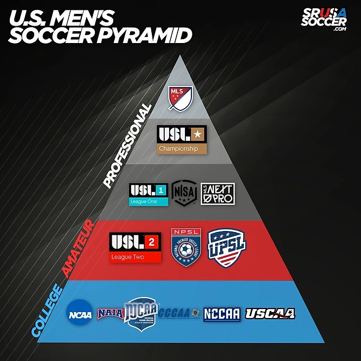 Футбол в США делится на профессиональный и не профессиональный. Если к первому традиционно относятся профессиональные клубы МЛС и Чемпионшипа (следующей по силе лиги), то к непрофессиональному - любительский и университетский. Да что говорить, вот ниже структура в виде пирамиды: