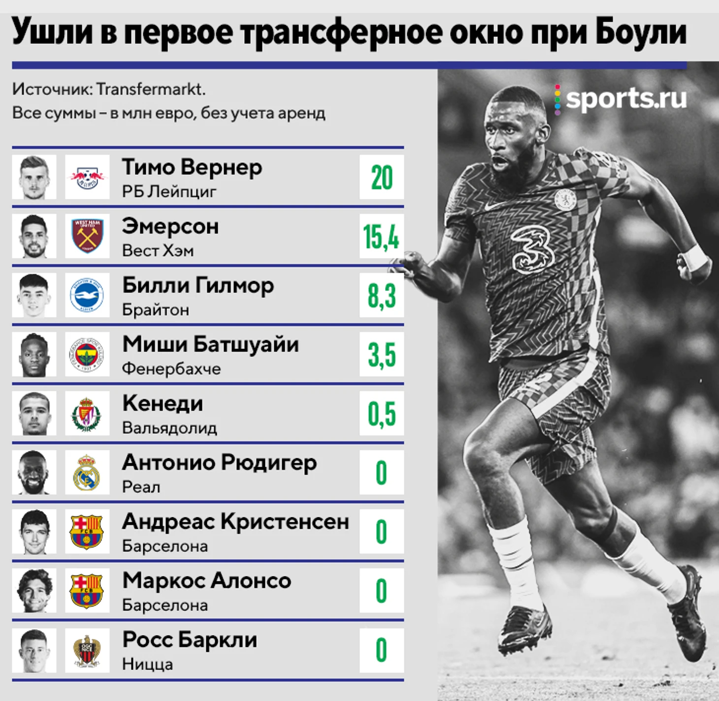 • Кажется, главной потерей стал уход Рюдигера свободным агентом. Тухель говорил, что он и клуб «не могли продолжать бороться за него из-за санкций», а сам Антонио запрашивал 12,5 млн евро в год по новому контракту и подписной бонус в 20 млн евро. • Всего в сезоне-2022/23 «Челси» заработал на продажах 67,8 млн евро. Зимой Жоржиньо ушел в «Арсенал» за 11,3 млн, аренда Лукаку в «Интер» принесла еще 7,8 млн. Первый официальный матч с новым владельцем «Челси» сыграл в августе 2022-го. За год от основы на игру с «Эвертоном» осталось всего четыре футболиста.