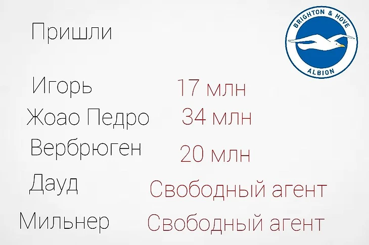 Для Брайтона лето проходит очень мощно. 74 млн было потрачено на трансферы. Все ли они оправдают ожидания? Посмотрим в новом сезоне.