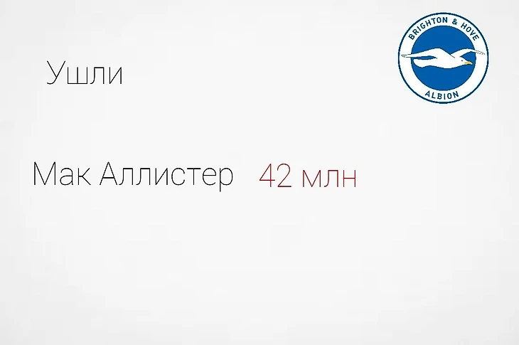 Так как же готовится Брайтон к новому сезону? Трансферная компания у чаек просто космос. Давайте начнём с потерь. Из главных звёзд ушёл только Мак Аллистер. Большая потеря для клуба, но этого было не избежать. Игрок блеснул на ЧМ + клаусула всего лишь 34 млн. Смешные деньги для топ клубов.