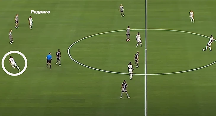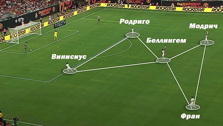 Пример на предсезонке с «Ман Юнайтед»: Джуд забил первый гол за «Реал» за счет рывка по центру, пока Джуниор и Родриго дают ширину.