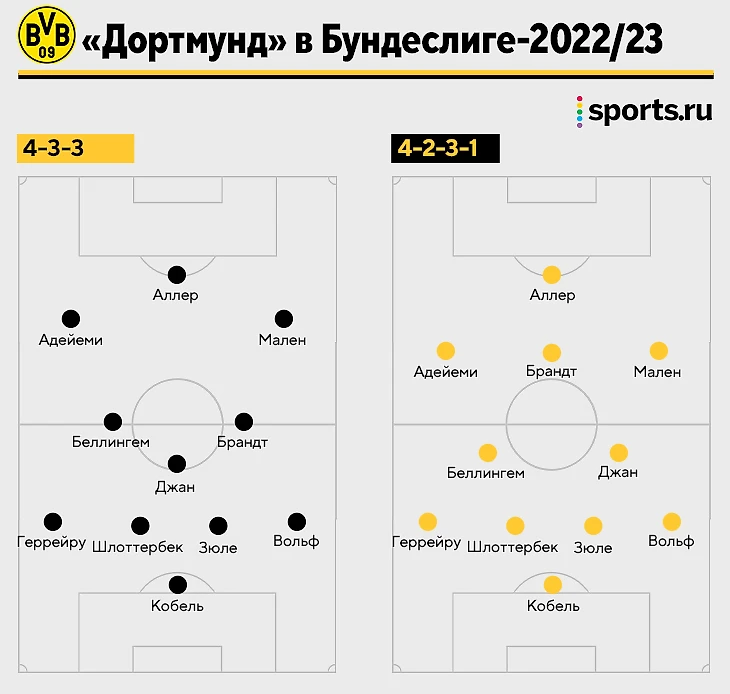 В прошлом сезоне «Дортмунд» регулярно менял схемы, превращая стандартные 4-3-3 в 4-2-3-1 или 4-5-1 по необходимости. Это однородные расстановки, но позиции у пары игроков менялись: например, по ходу кампании Геррейру ушел с места латераля и переместился в центр поля. В рамках формаций двигался Юлиан Брандт.