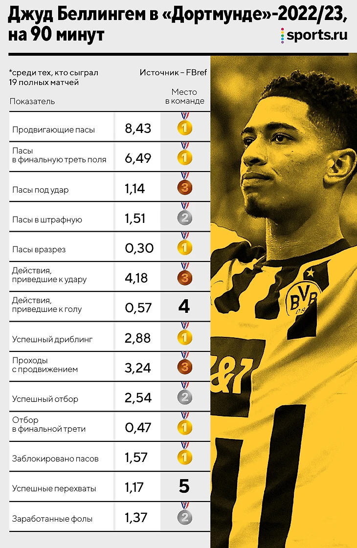 Беллингем – тотальный универсал. Несмотря на то, что любит фазу владения, дает огромный объем работы и в обороне. Проще всего это отследить через показатели в прошлогодней «Боруссии»: