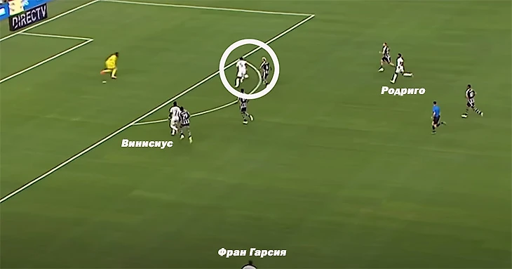Обратите внимание на позицию Франа Гарсии. Он постоянно располагался так высоко: похоже, так Анчелотти собирается маскировать последствия перевода Вини в центр.