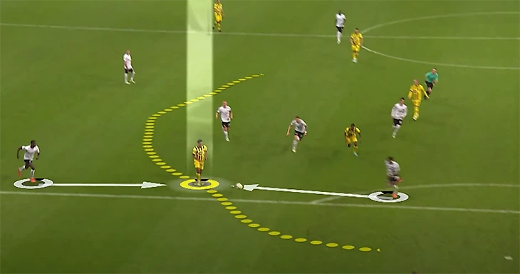 Решение среднего игрока: просто ринуться на соперника с мячом, а Джуд смещается в другую зону: