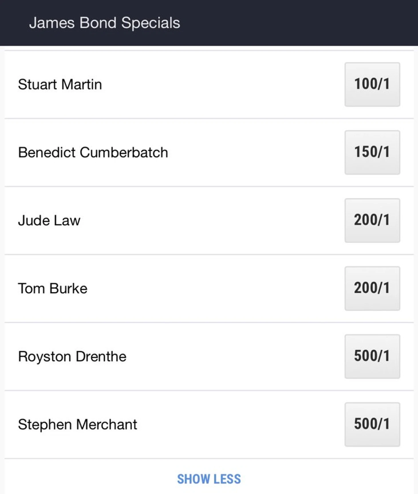 Sky, тем временем, выставил коэффициенты на то, что следующим Бондом станет дуэт комментаторов Sky Sports Джейми Реднапп и Майка Ричардс. Коэффициент на победу Реднаппа составляет 1000/1, а Ричардса − 2500/1.