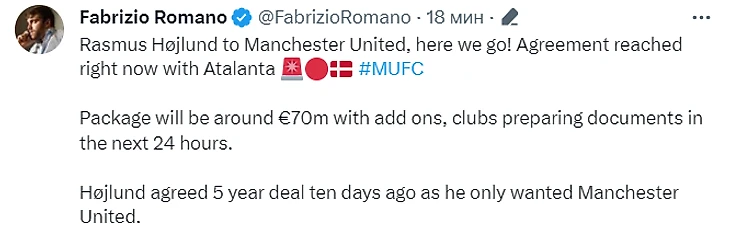 «Прямо сейчас достигнуто соглашение с «Аталантой». «МЮ» заплатит около 70 млн евро плюс бонусы. Клубы подготовят документы в течение ближайших 24 часов.