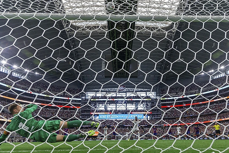 Начал Ориоль Ромеу, только вернувшийся в «Барсу» – перекладина. Дальше попадали только мадридцы. Еще четыре перекладины: с пенальти Винисиус (назначили за руку Араухо), с игры Винисиус – ударил с разворота и раньше времени побежал праздновать, хотя мяч не пересек линию, во втором тайме мощно издали бил Орельен Тчуамени, следом снова Винисиус.