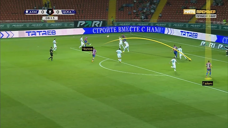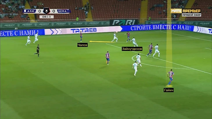 После удаления Быстрова ЦСКА стало сложнее играть шире. 4-4-1 «Ахмата» часто превращались в 6-2-1 и 6-3-0, так как Ильин и Олейников подсаживались в защиту, Тимофеев и Камилов создавали плотность рядом с эпизодом на фланге, а четверка защитников обороняла штрафную.