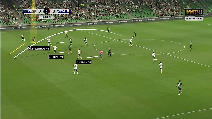 «Сочи» приятно удивил против «Краснодара». Впечатлили желание центральных защитников двигать мяч (несмотря на пару обрезов, Литвинов и Дркушич порадовали) и подвижность атакующей группы. До перерыва «Краснодару» было сложно создавать моменты – мешали компактные 5-4-1, фланговая агрессия и ситуативное давление при передачах назад. «Сочи» оставлял минимальные зазоры, которые закрывали центральные защитники, если Баши, Кордоба или Ахметов спускались в глубину. Хотя такая игра оставляла возможности для «Краснодара», если полузащитники правильно пользовались агрессией ЦЗ «Сочи».