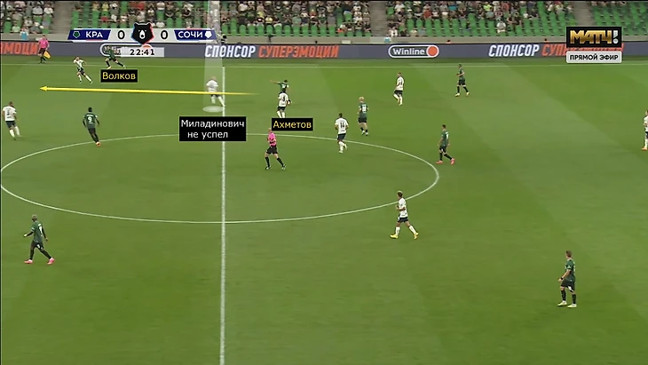 В итоге острота приходила через длинные передачи. Например, удар Баши почти с угла вратарской – результат своевременной закидушки Сафонова под прессингом («Сочи» растянулся, Кордоба отборолся, и атака ушла на фланг), Ахметов наказал Миладиновича (Кордоба едва не замкнул прострел), а Волков умно отреагировал на длинную передачу Кайо (вся тройка ЦЗ ориентировалась на игроков «Краснодара»).