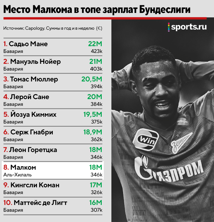 • Формально Садьо Мане уже не игрок «Баварии», но так как он покинул клуб совсем недавно, мы оставили его в таблице. В «Аль-Насре» сенегалец будет получать более 40 миллионов евро в год после уплаты налогов. • Малком зарабатывает больше Альфонсо Дэвиса (11,2 млн), Себастьяна Аллера (11 млн) и Тимо Вернера (10 млн).