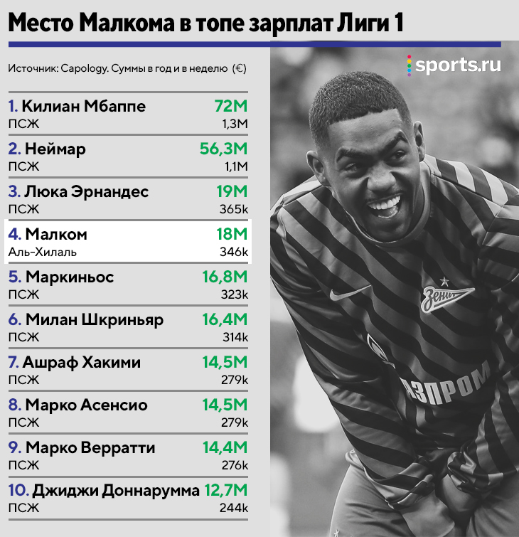 • Лига 1 уже не входит в топ-5 лиг Европы – уступила место Эредивизи. Но так как самый высокооплачиваемый футболист чемпионата Нидерландов (Стивен Бергевейн) получает всего 4,6 млн евро в год, мы решили сравнивать зарплату Малкома в более конкурентной среде.