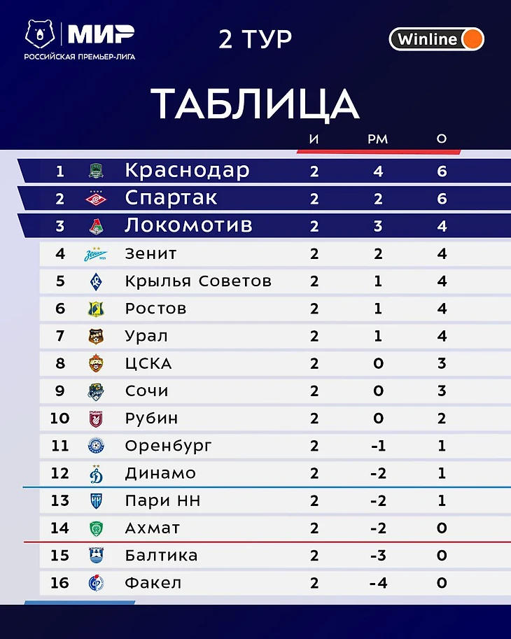 По итогам первого тура я выделил две команды ("Краснодар" и "Спартак") - и после второго тура они остались единственными, кто не потерял очки.