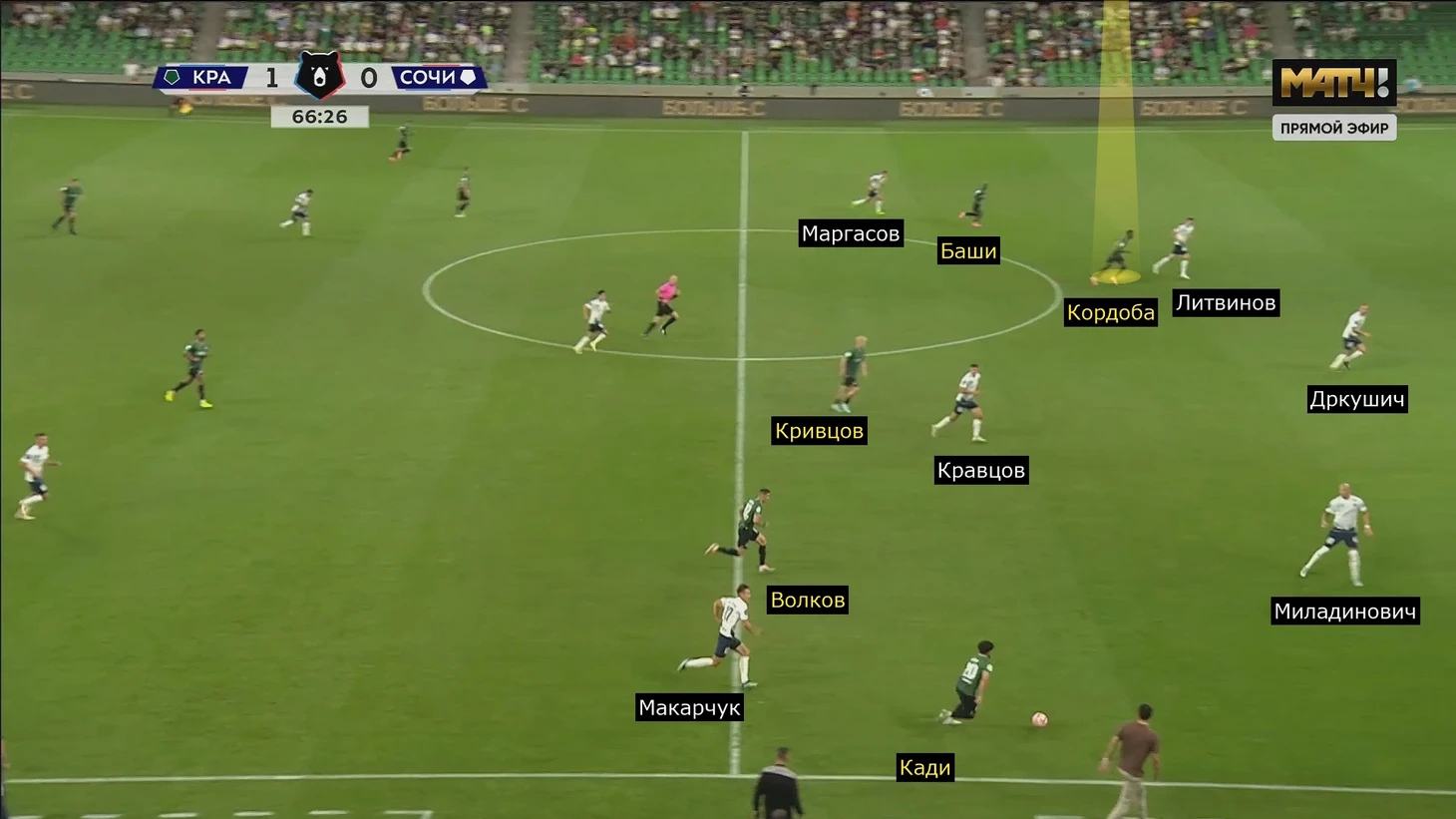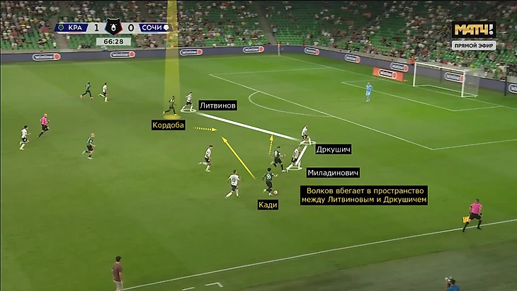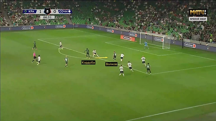 Впечатляет, как Кордоба создает себе моменты. Джон разрывает в единоборствах, у него порядок с силовым дриблингом, он грамотно открывается в глубину и за спину, отваливается от защитников. Классный пример оценки эпизода от Кордобы: Волков и Кади разгонялись справа – Макарчук и Кравцов быстро окажутся отыгранными, поэтому нападающих встречала растянутая тройка ЦЗ. Кордоба следил за динамикой, не сближаясь с партнерами, чтобы Литвинов не мог подстраховать Дркушича.