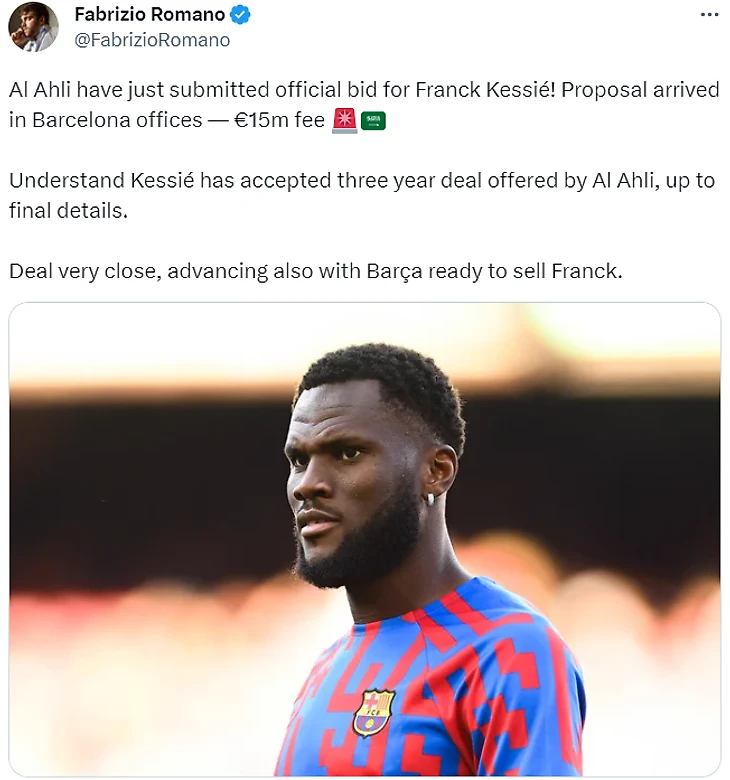 Кессиэ согласился на 3-летний контракт, предложенный «Аль-Ахли», а также со всеми деталями соглашения. Сделка близка к завершению, «Барса» готова продать Франка».