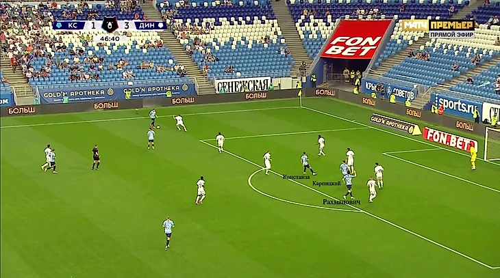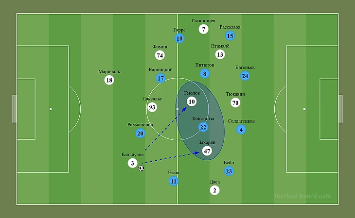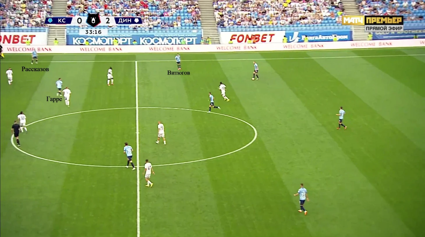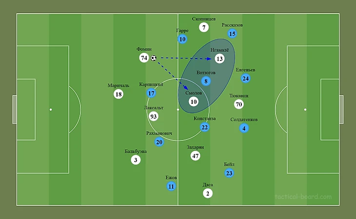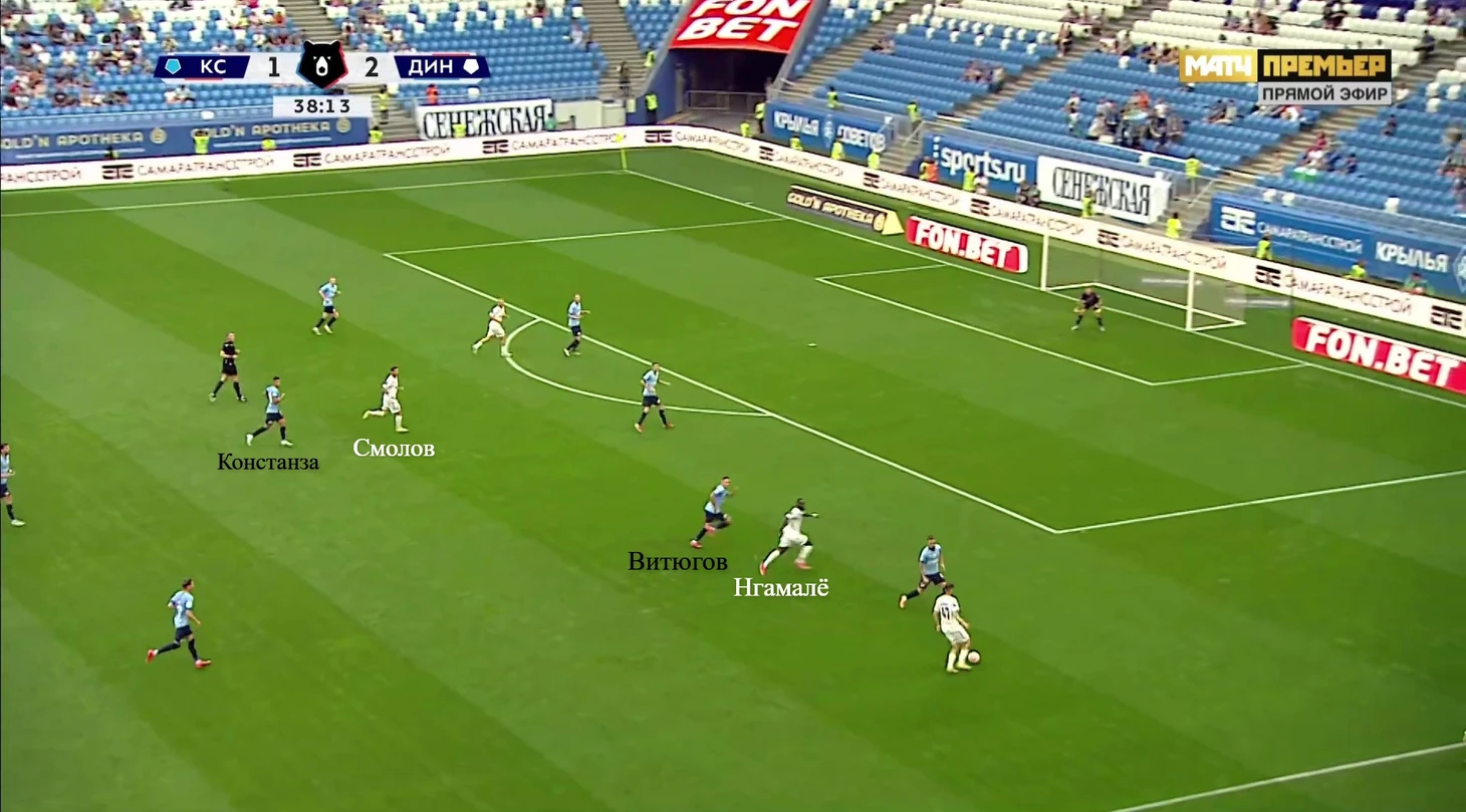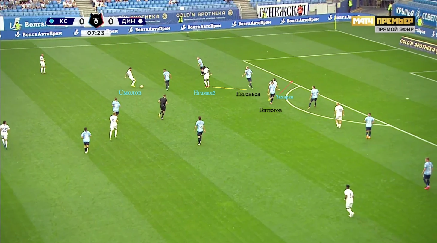 В таких ситуациях на правом фланге Гарре всегда оставался широко, а вот слева Ежов иногда уходил в центр и тогда сразу шла передача на Дасу. Крайние защитники у «Динамо» всегда находились в очень высоких позициях и получая мяч, имели несколько вариантов для короткого паса. План Лички работал и гости раз за разом продвигали мяч подобным образом и проникали на чужую треть. Дальше сразу несколько игроков предлагали себя, делая забегание за спину: Тюкавин стягивал на себя центральных защитников, Нгамалё или Захарян открывались в полуфлангах, а Скопинцев и Даса создавали ширину. Именно так и был забит первый гол. Захарян сместился налево и Смолов отдал отличный пас на забегающего Арсена.