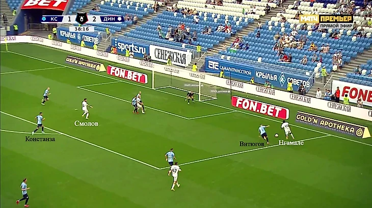 В этом сезоне выборка пока мала, но тенденция очевидна. Действия Смолова в чужой штрафной так же изменились: теперь он вбегает вторым темпом в поиске свободной зоны, а не борется с защитниками как Тюкавин. Пока работает просто идеально – у Фёдора уже два гола и оба он забил именно в таком стиле. В Самаре во время голевой атаки за ним не побежал Костанза. Стоит отметить, что для центральных полузащитников «Крыльев» первый тайм получился просто ужасным: Витюгов упустил Захаряна в моменте с голом, на 39 минуте не смог помешать Нгамалё в похожем эпизоде, а Костанза оставил Смолова без опеки.