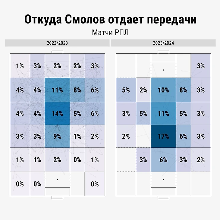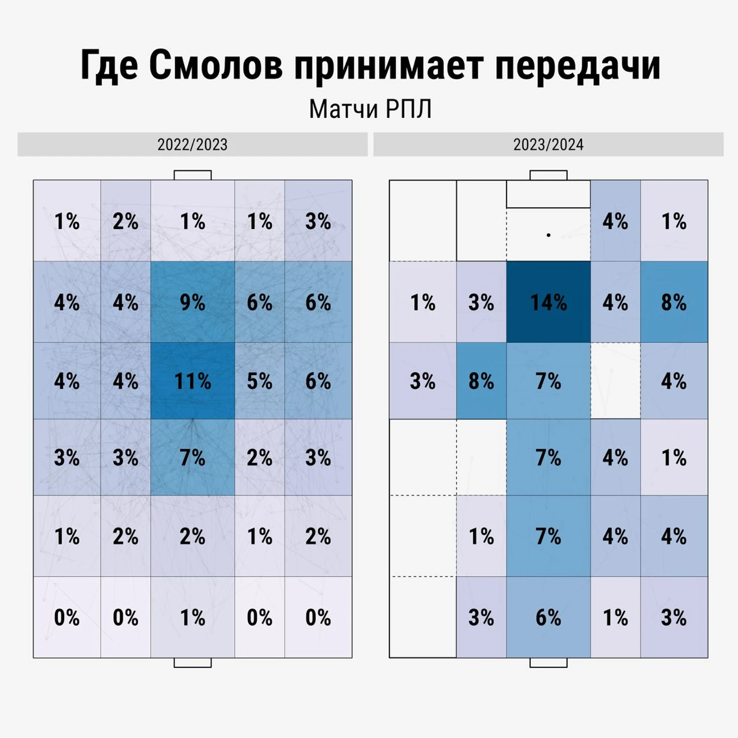 О Смолове стоит поговорить отдельно. Фёдор уже начинает раскрываться на новой позиции под руководством Лички. Марцел использует нападающего ближе к центру поля и именно он становится ключевым игроком нового «Динамо». Голевая на Захаряна – отличное подтверждение. Часто ли раньше Смолов отдавал такие передачи? Нет, он всегда находился в центре нападения. Сейчас его роль сильно изменилась, об этом говорят и карты передач, которые принимает и отдаёт Смолов.